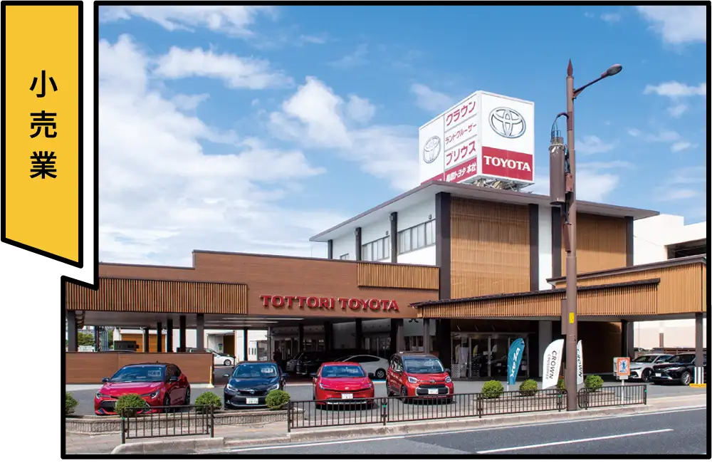 新車販売(トヨタ事業・レクサス事業)、中古車販売、自動車の定期点検および整備、自動車損害保険取り扱い、au・UQ携帯電話取り扱い。