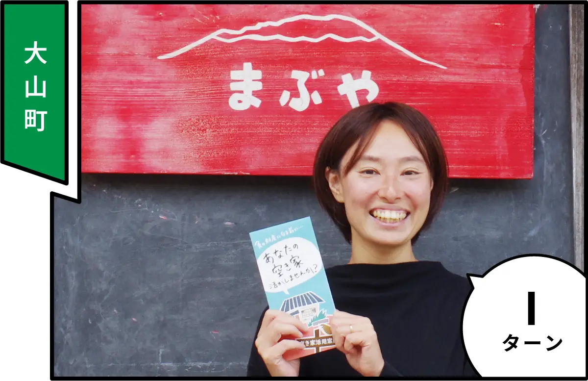 東京出身。2015年、大山町に住む以前同じ会社に勤めていた先輩を訪ねて遊びにきたことをきっかけに大山町で暮らす人たちに出会い移住。移住後に出会った地元出身の夫と結婚し、現在は一児の男の子の子育て中。東京時代の仕事は企業ででグラフィックデザイナーをしており、移住後はフリーのデザイナーとして活動中。
